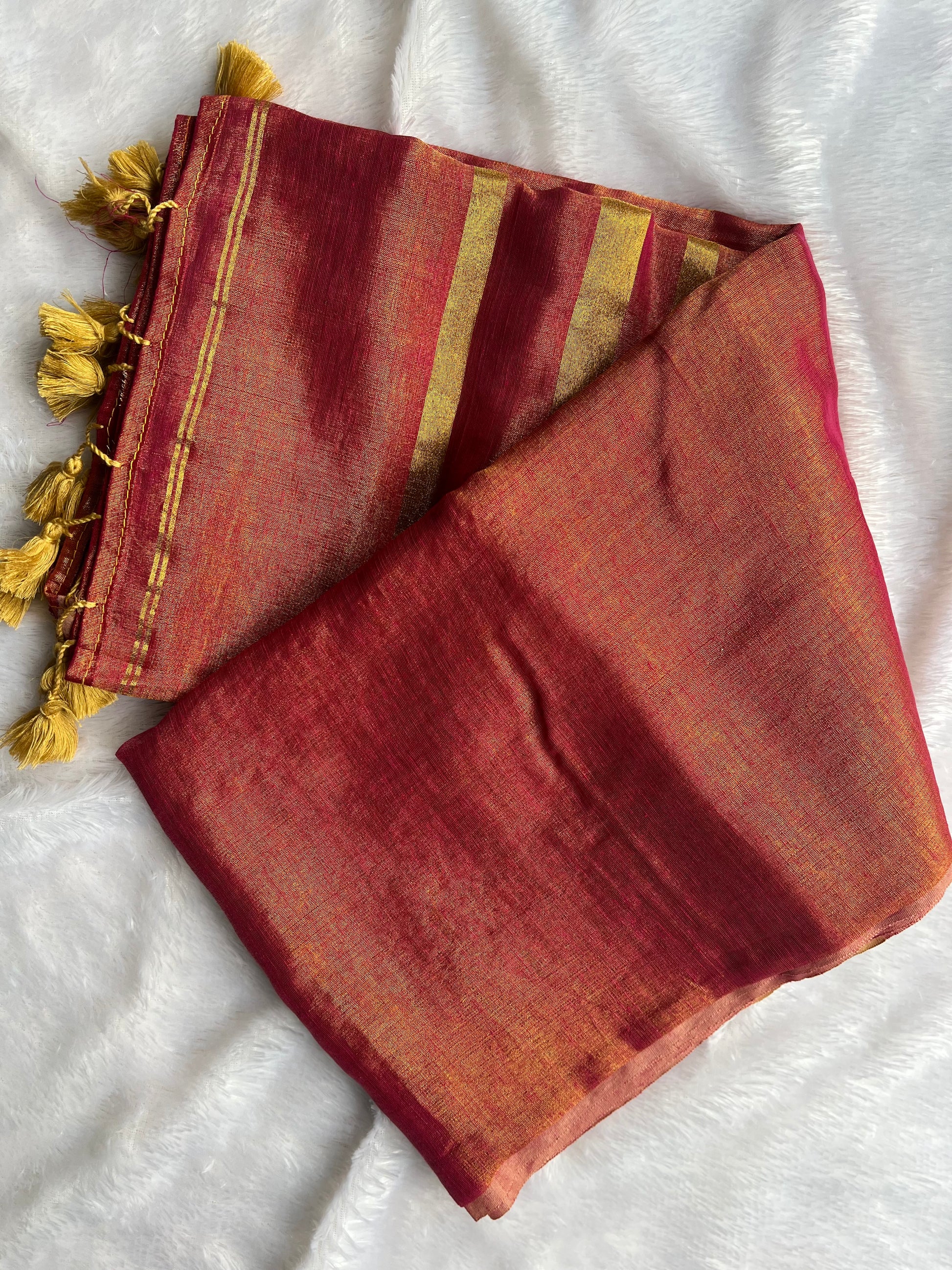Introducing our PlainTissue saree, perfect for any occasion. This saree features a running blouse and stripes along with tassels on the pallu for added elegance. The lightweight and breathable fabric make it ideal for all-day wear. Upgrade your wardrobe with this versatile and stylish saree.